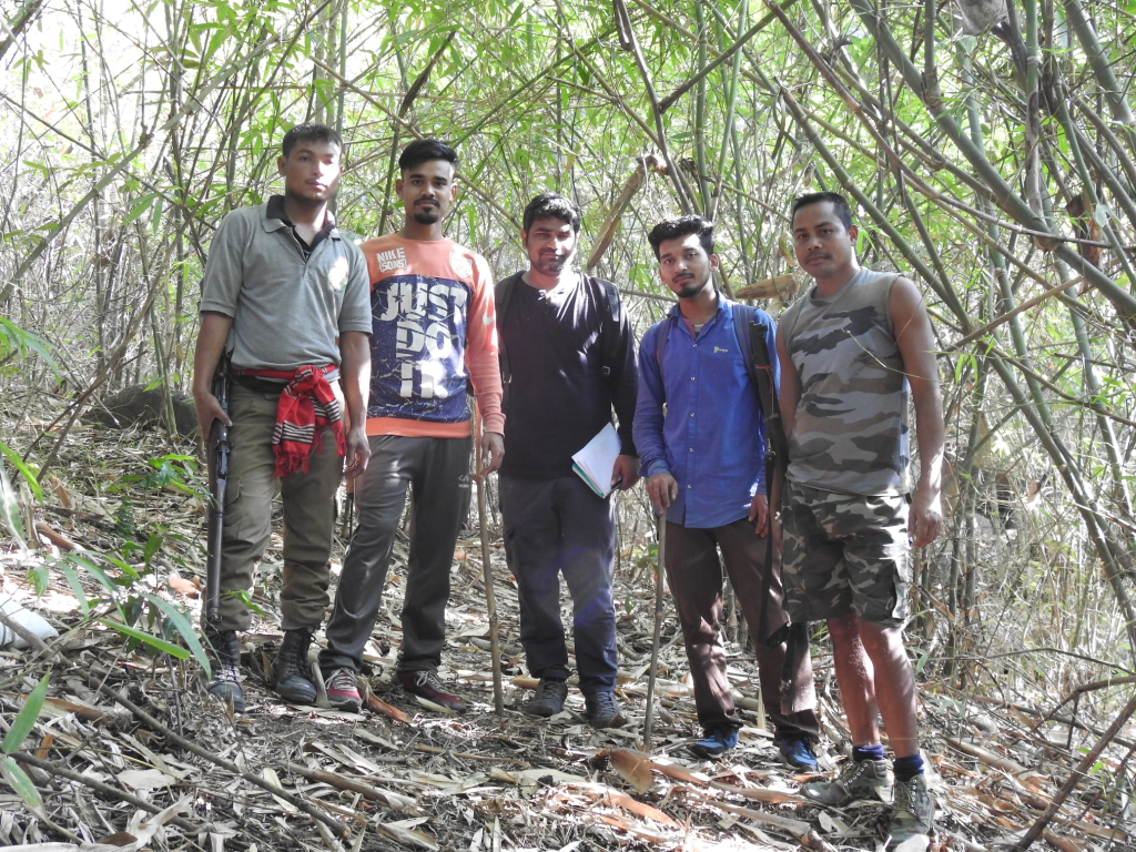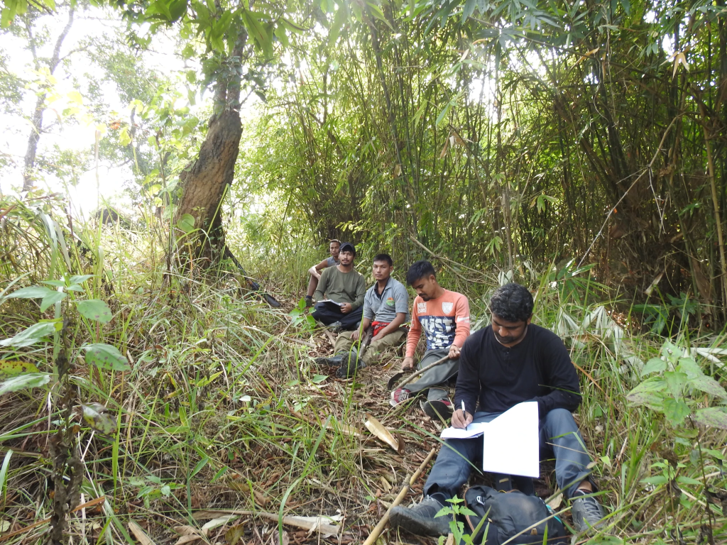 We went to the field early in the morning from our base camp towards the Haldhibari beat office. Two forest guards, Nilok and Biman, joined us on the survey. They knew the Karbi Hills well, which made them valuable companions. We brought all the necessary supplies for our safety measures, also we took rice and chicken for lunch, using bamboo as our cooking method.